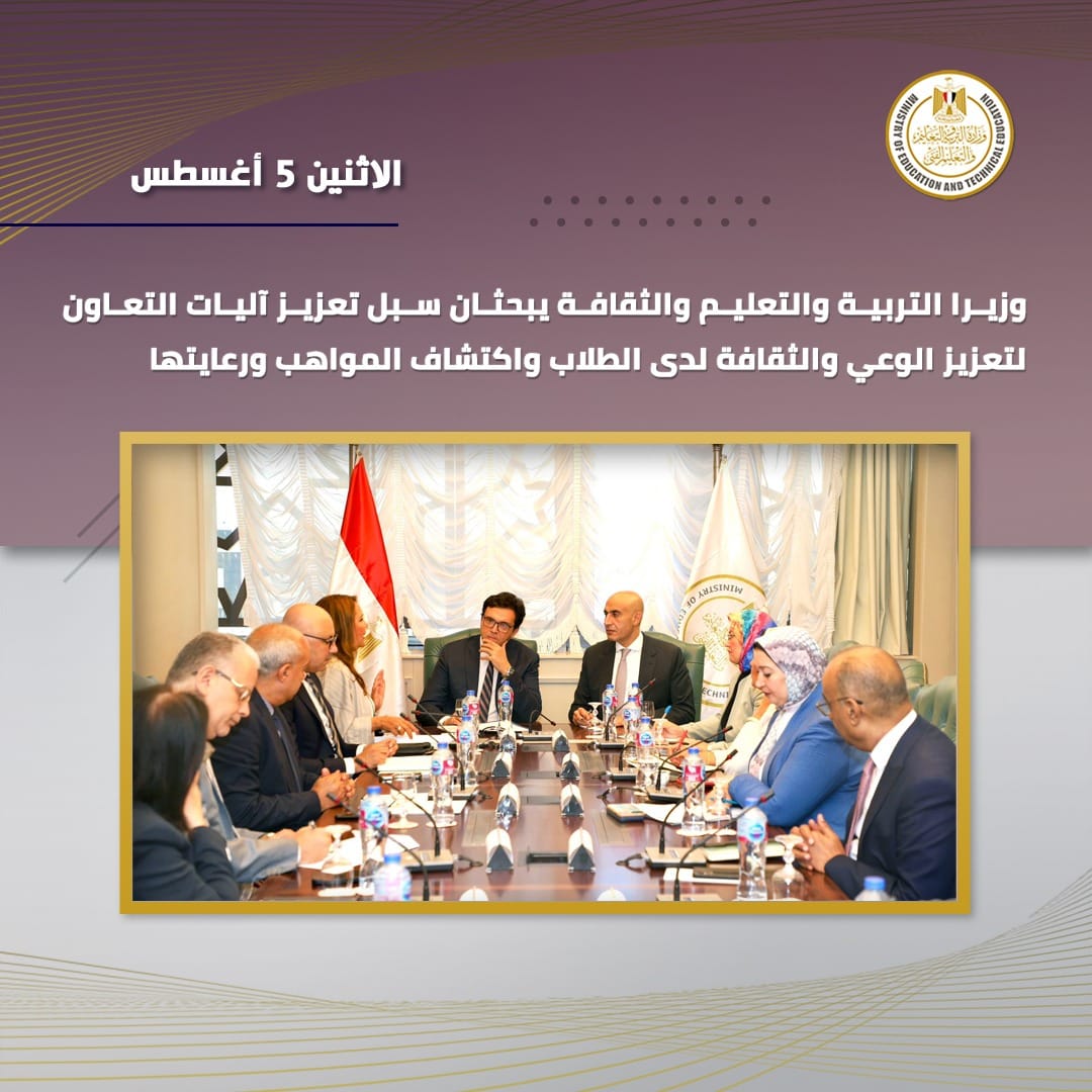 وشهد اللقاء مناقشة سبل نشر الوعي الثقافي وتنظيم محاضرات وندوات ثقافية متنوعة، وتزويد المكتبات المدرسية بالكتب التي تعكس الهوية الوطنية وثراء المعلومات، فضلا عن عن بحث آليات تنظيم الفعاليات والأنشطة بين الوزارتين، وكذا مناقشة البروتوكول الموقع بين الوزارتين لتعزيز تثقيف الطلاب ووضع آلية لاكتشاف الموهوبين واختيارهم، من خلال مراكز تنمية القدرات للوصول الى المحافظات البعيدة والمناطق النائية، بالإضافة إلى إعداد دورات تدريبة داخل المدارس لتوعية الطلاب.