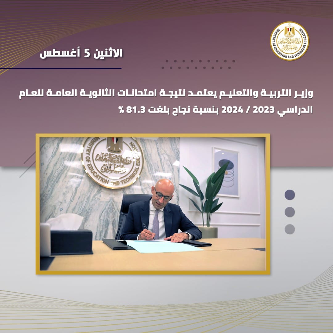 اعتمد السيد محمد عبد اللطيف وزير التربية والتعليم والتعليم الفني،الاثنين، نتيجة امتحانات إتمام شهادة الثانوية العامة للعام الدراسي ٢٠٢٣ / ٢٠٢٤، بنسبة نجاح بلغت ٨١.٣ ٪.