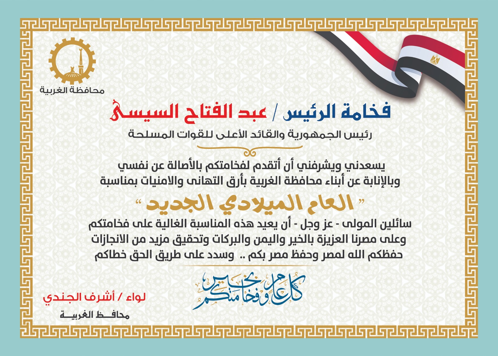 “يسعدني ويشرفني أن أتقدم لفخامتكم بالأصالة عن نفسي وبالإنابة عن أبناء محافظة الغربية بأرق التهاني والأمنيات بمناسبة العام الميلادي الجديد. سائلين المولى - عز وجل - أن يعيد هذه المناسبة الغالية على فخامتكم وعلى مصرنا العزيزة بالخير واليمن والبركات، وتحقيق مزيد من الإنجازات. حفظكم الله لمصر وحفظ مصر بكم وسدد على طريق الحق خطاكم.”
