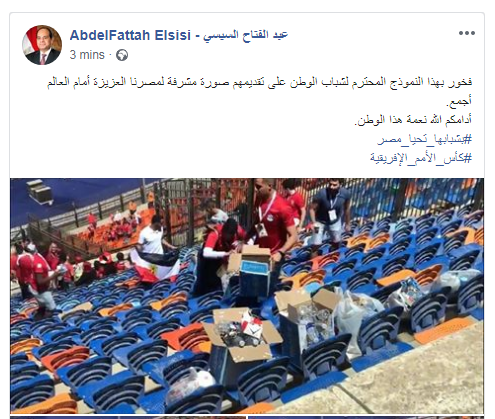 أبدى رئيس جمهورية مصر العربية عبدالفتاح السيسي رئيس جمهورية، فخره بشباب مصر ممن حضروا مباراة مصر في افتتاح كأس الأمم الأفريقية أمس أمام فريق زيمبابوي.