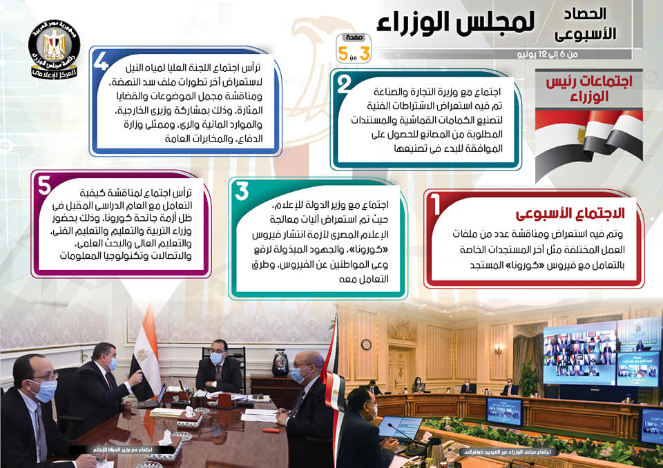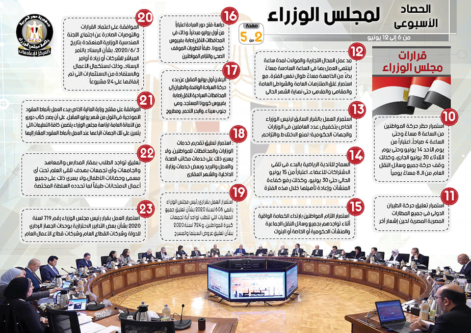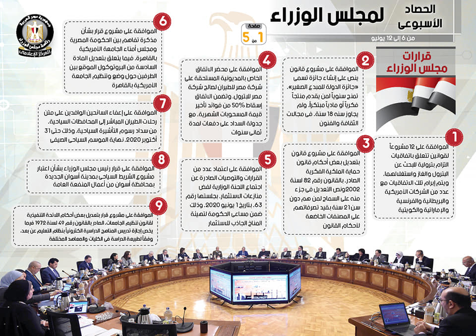 بالإنفو جراف... الحصاد الأسبوعي لمجلس الوزراء خلال الفترة من 6 حتى 12 يونيو 2020