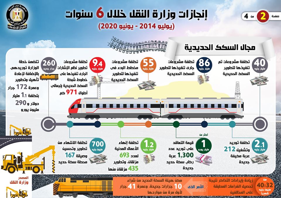 وأبرز الإنفوجراف، أن تكلفة توريد وتشغيل 212 عربة مكيفة جديدة بلغت 2.1 مليار جنيه، كما بلغت قيمة التعاقد على توريد 1300 عربة ركاب سكة حديد جديدة أكثر من مليار يورو، وكذلك بلغت تكلفة إنهاء الأعمال المدنية لعدد 693 مزلقاناً، وتطوير 435 مزلقاناً منها 1.2 مليار جنيه، كما تم الانتهاء من تطوير وتحسين وصيانة 167 محطة سكة حديد بتكلفة 700 مليون جنيه، في حين زادت إيرادات التذاكر نتيجة تحصيل الغرامات المطبقة على المخالفين من 32 إلى 40 مليون جنيه شهرياً، الأمر الذي مكن هيئة السكة الحديد من شراء 10 جرارات جديدة، وعمرة 41 جراراً لأول مرة من مواردها.