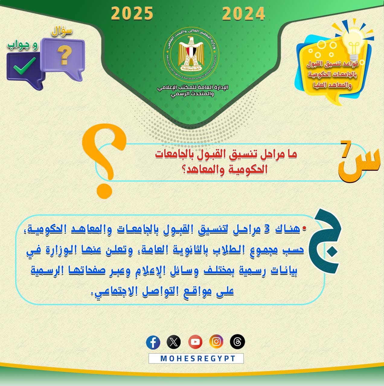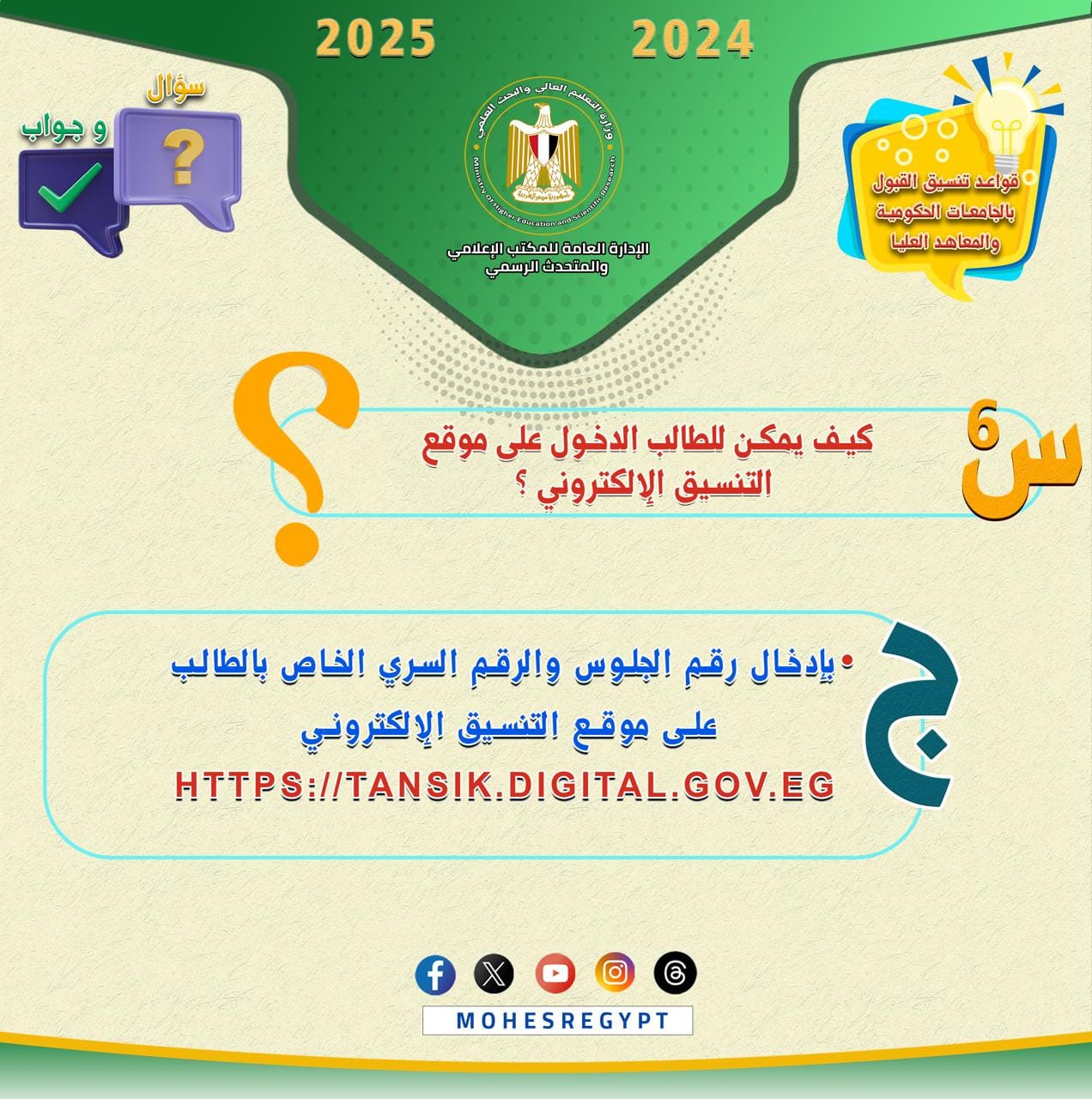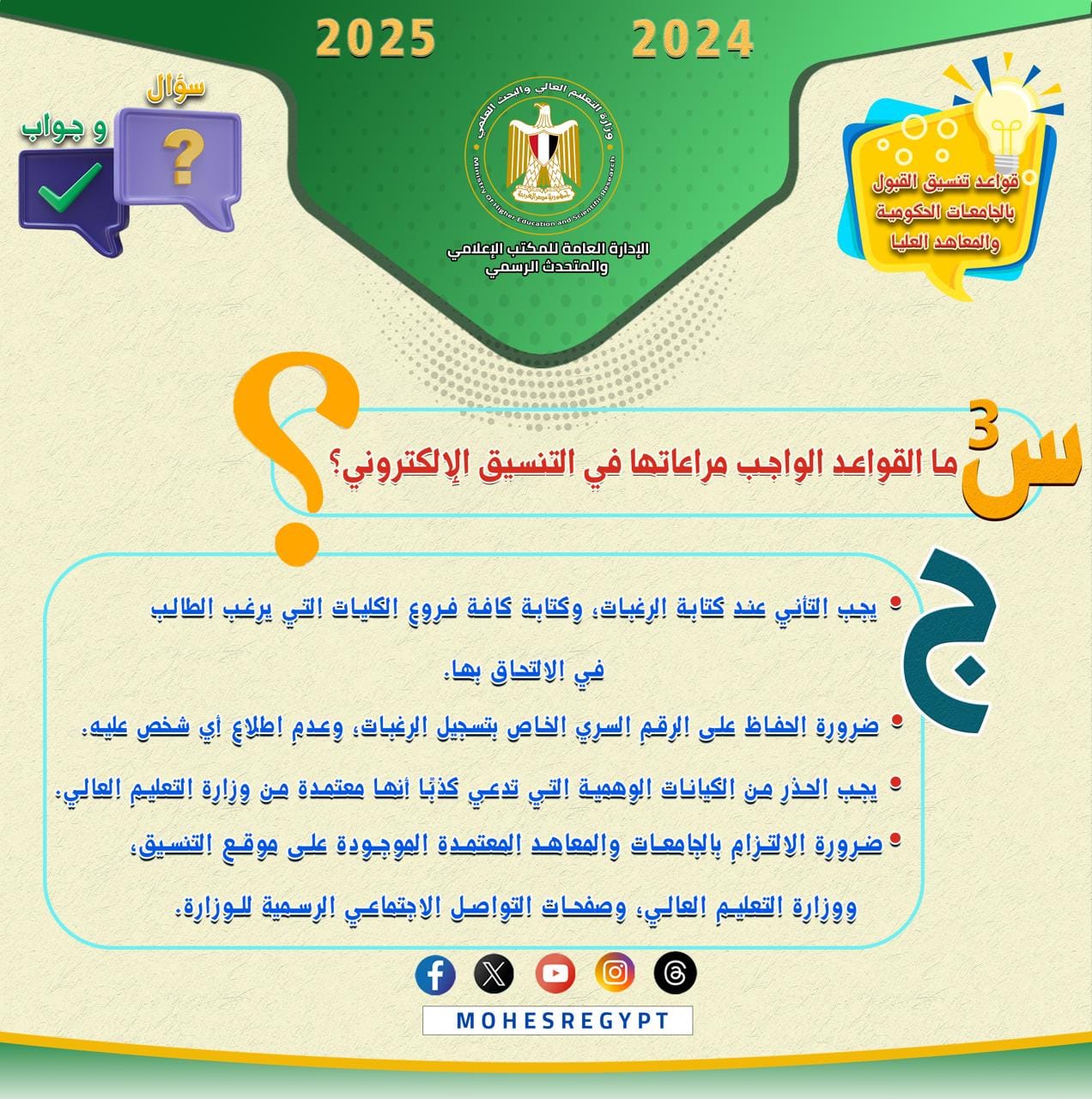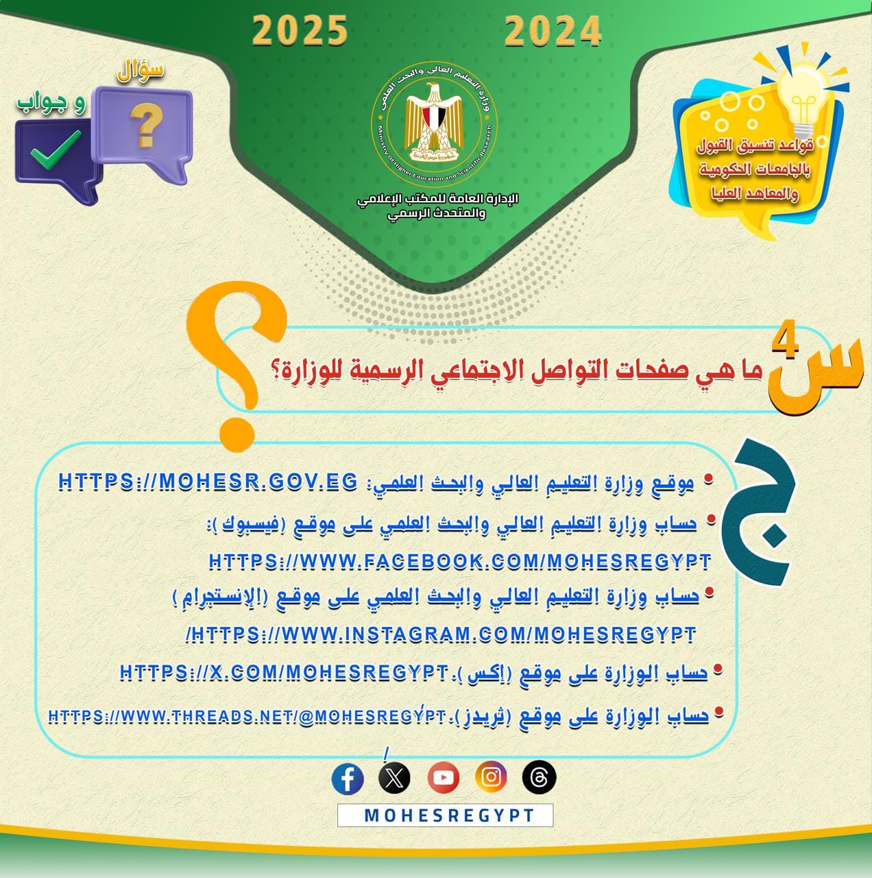 هذا، وسيتم نشر الأدلة الإرشادية وكافة الوسائل التوضيحية عبر الموقع الإلكتروني للوزارة والحسابات الرسمية لوزارة التعليم العالي والبحث العلمي على مواقع التواصل الاجتماعي التالية: