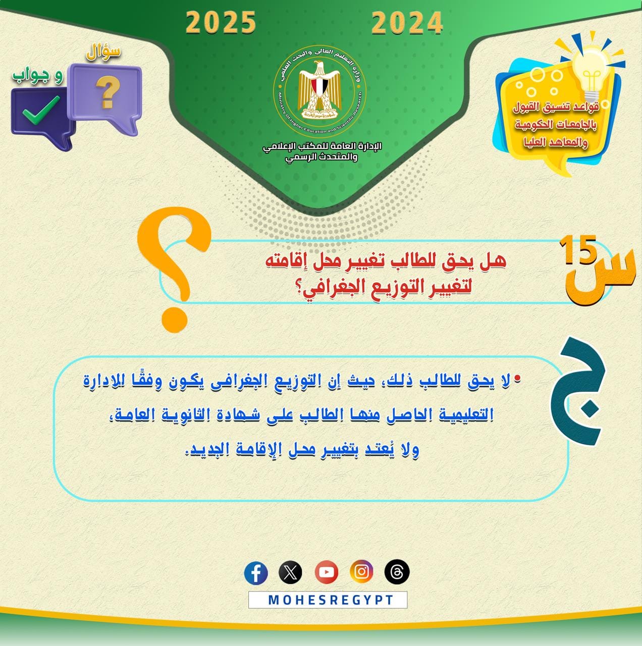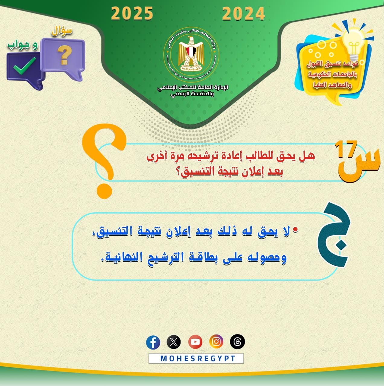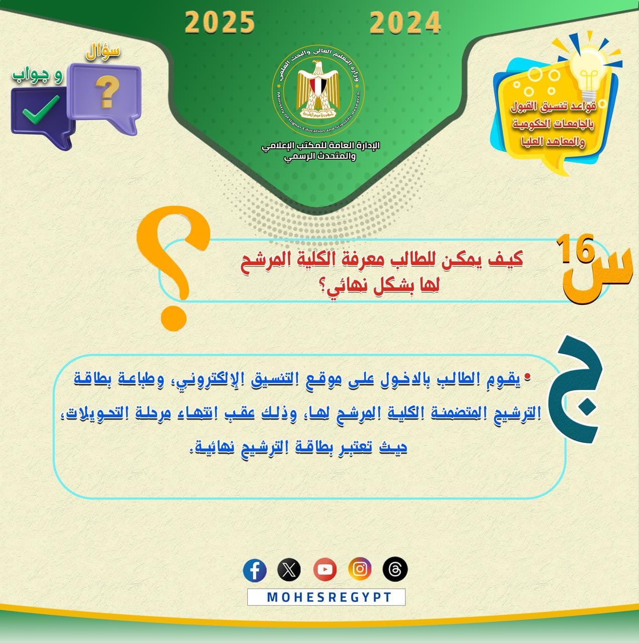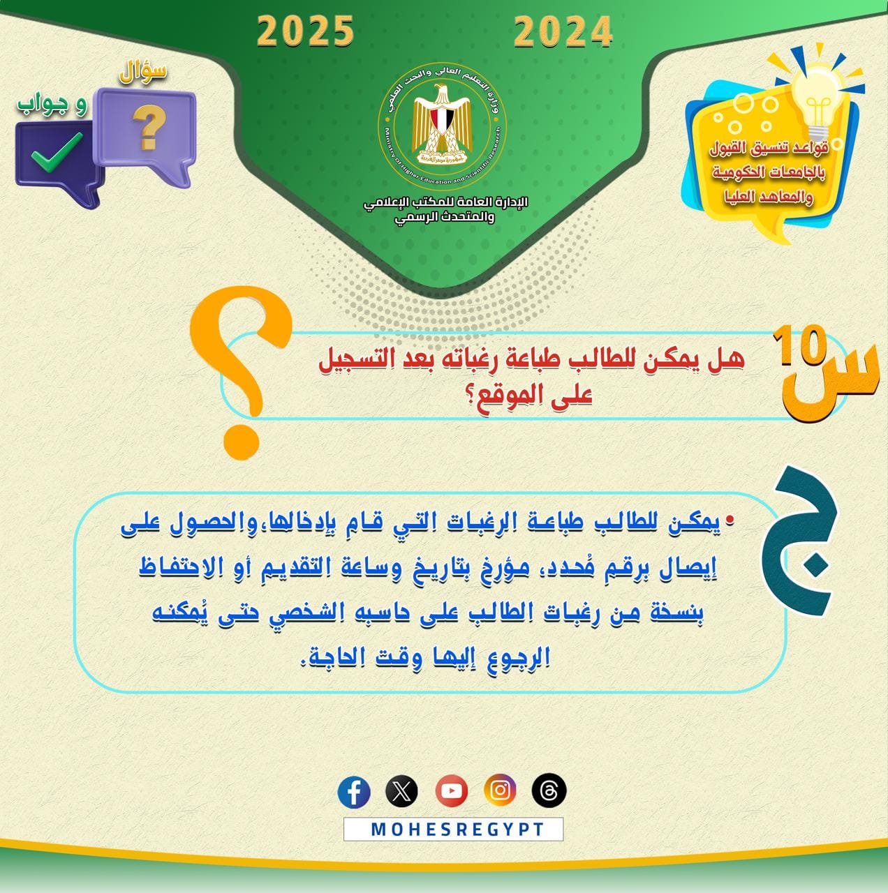هذا، وسيتم نشر الأدلة الإرشادية وكافة الوسائل التوضيحية عبر الموقع الإلكتروني للوزارة والحسابات الرسمية لوزارة التعليم العالي والبحث العلمي على مواقع التواصل الاجتماعي التالية: