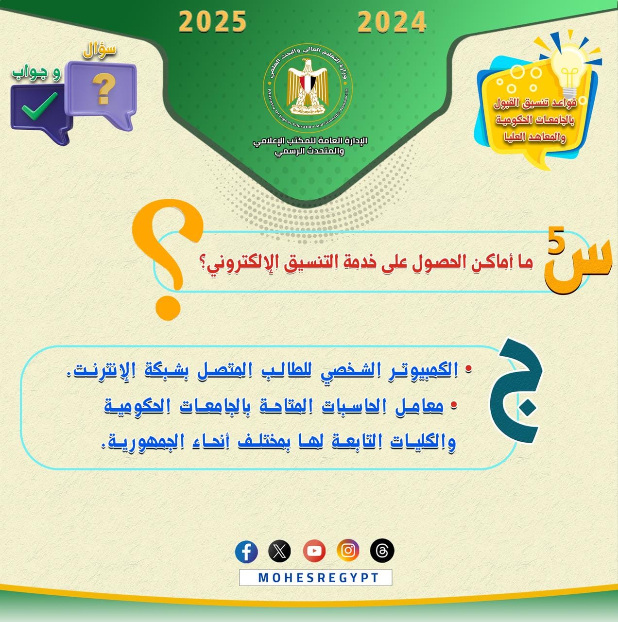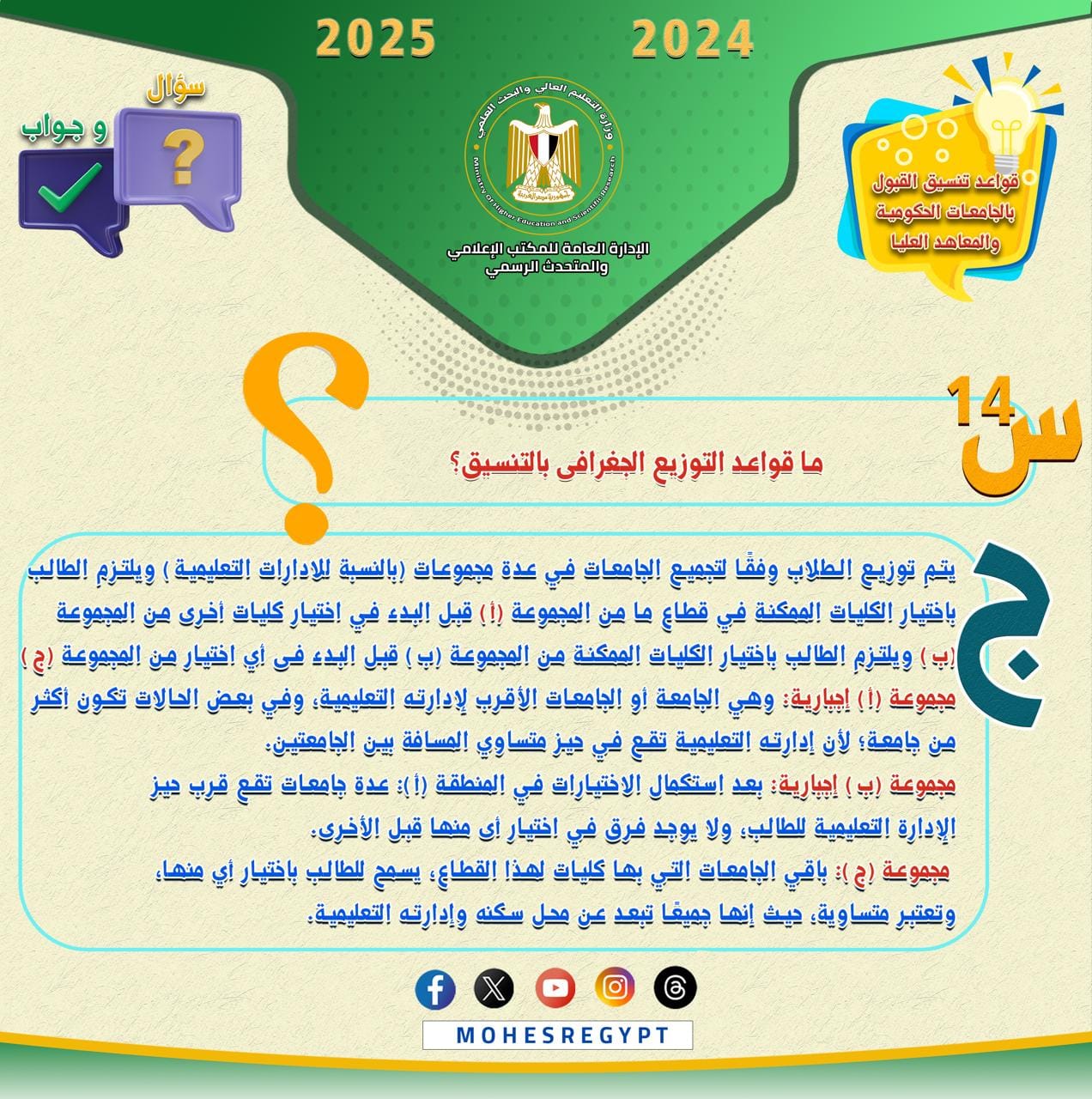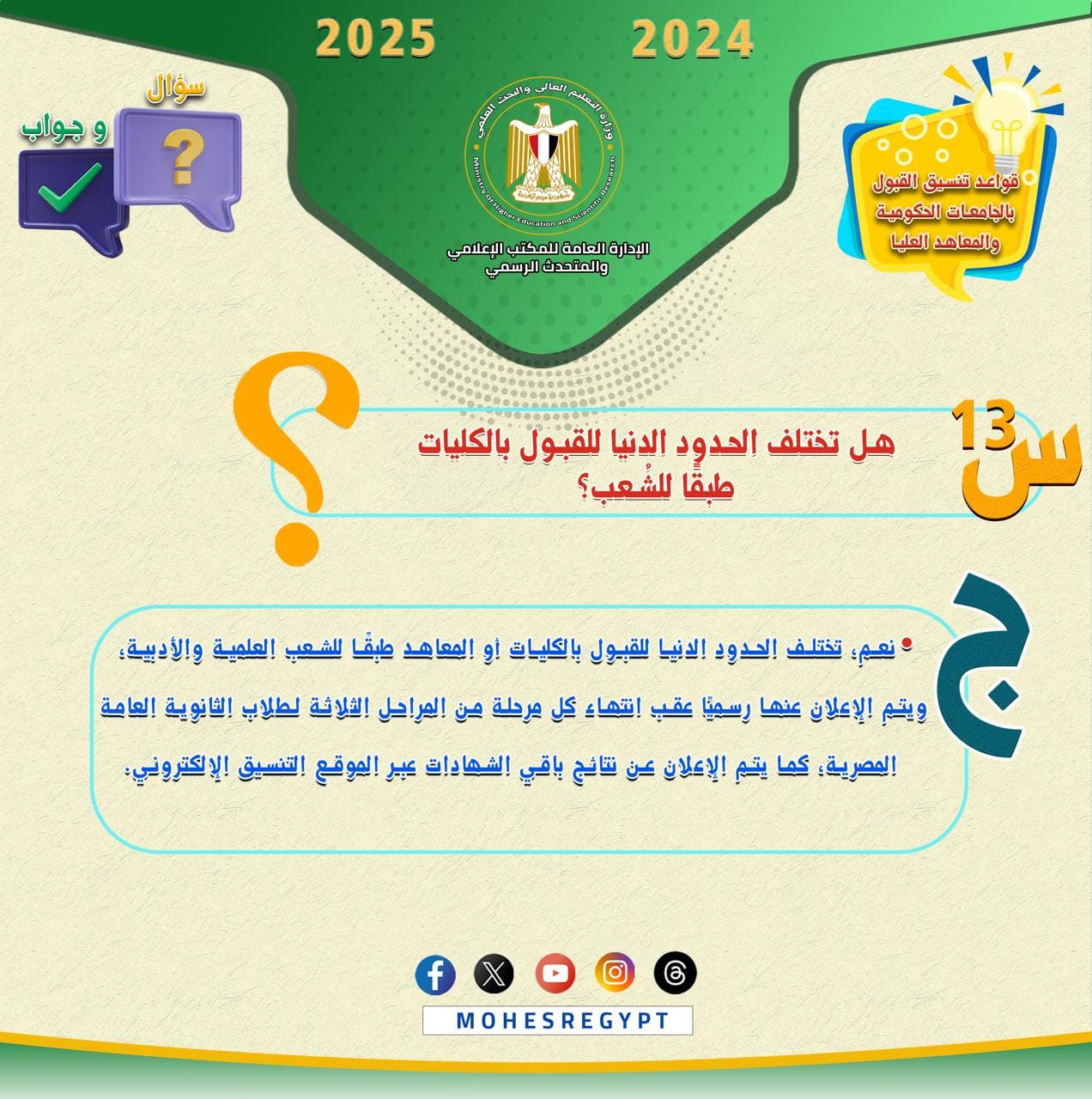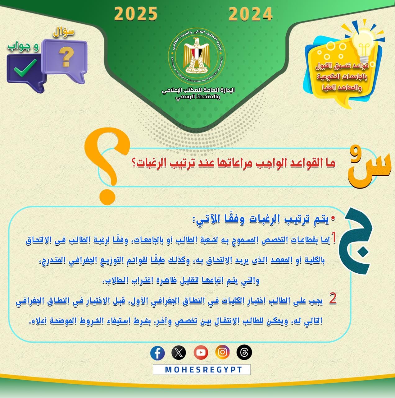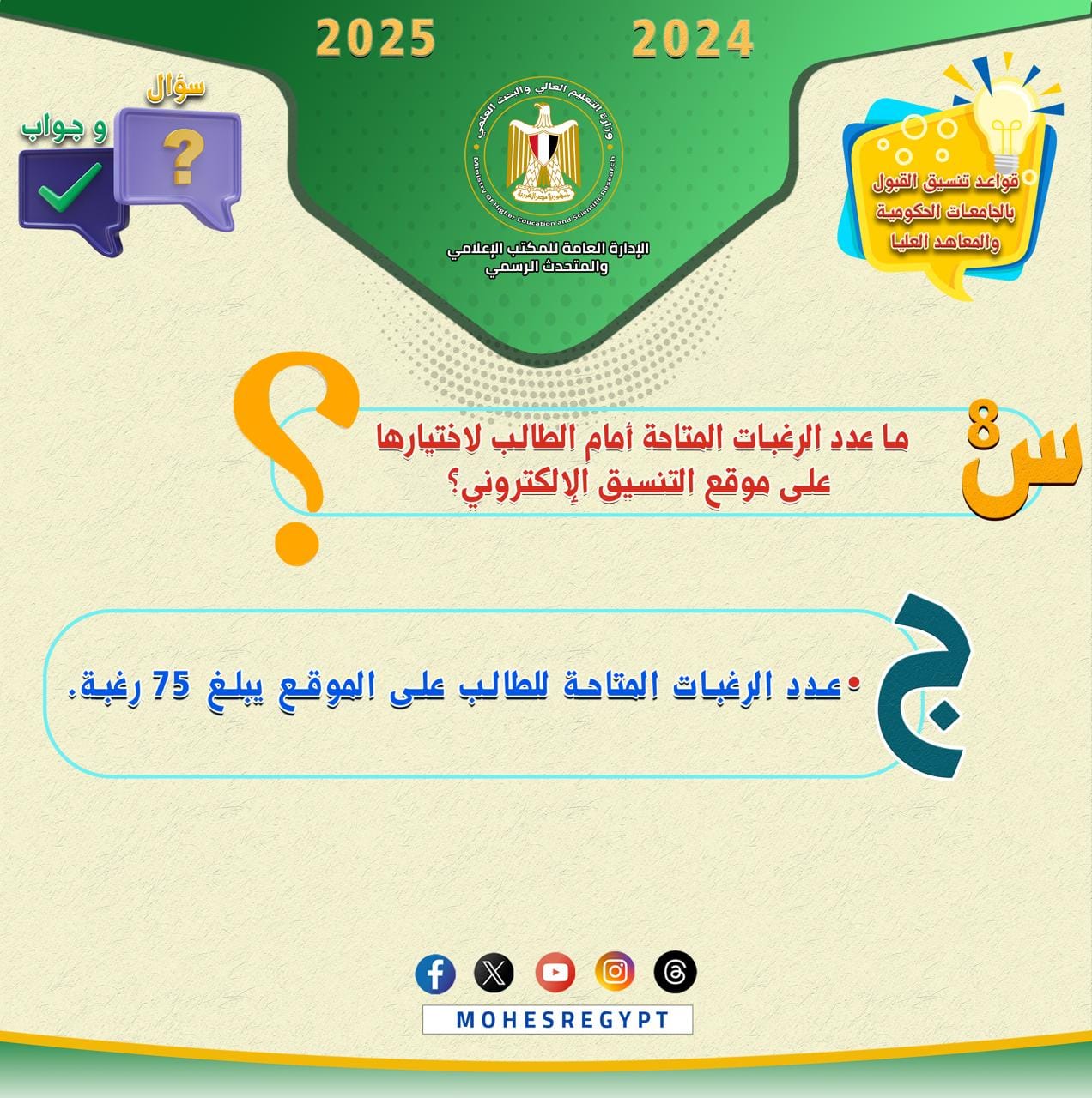 وتتضمن الانفوجرافات الحالية العديد من الأسئلة التي يبحث طلاب الثانوية العامة عن إجاباتها عند تسجيل رغباتهم للالتحاق بالجامعات الحكومية والمعاهد.